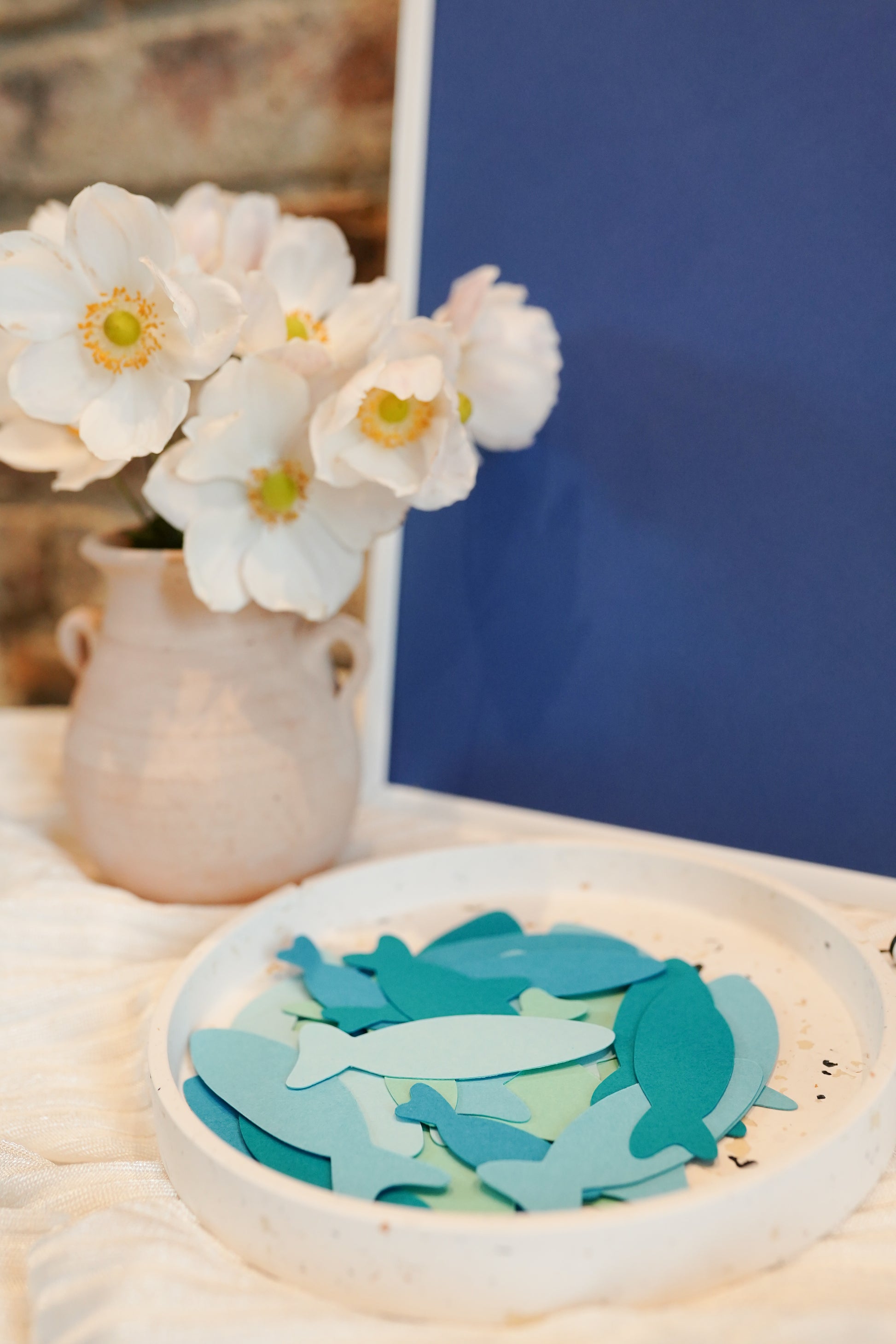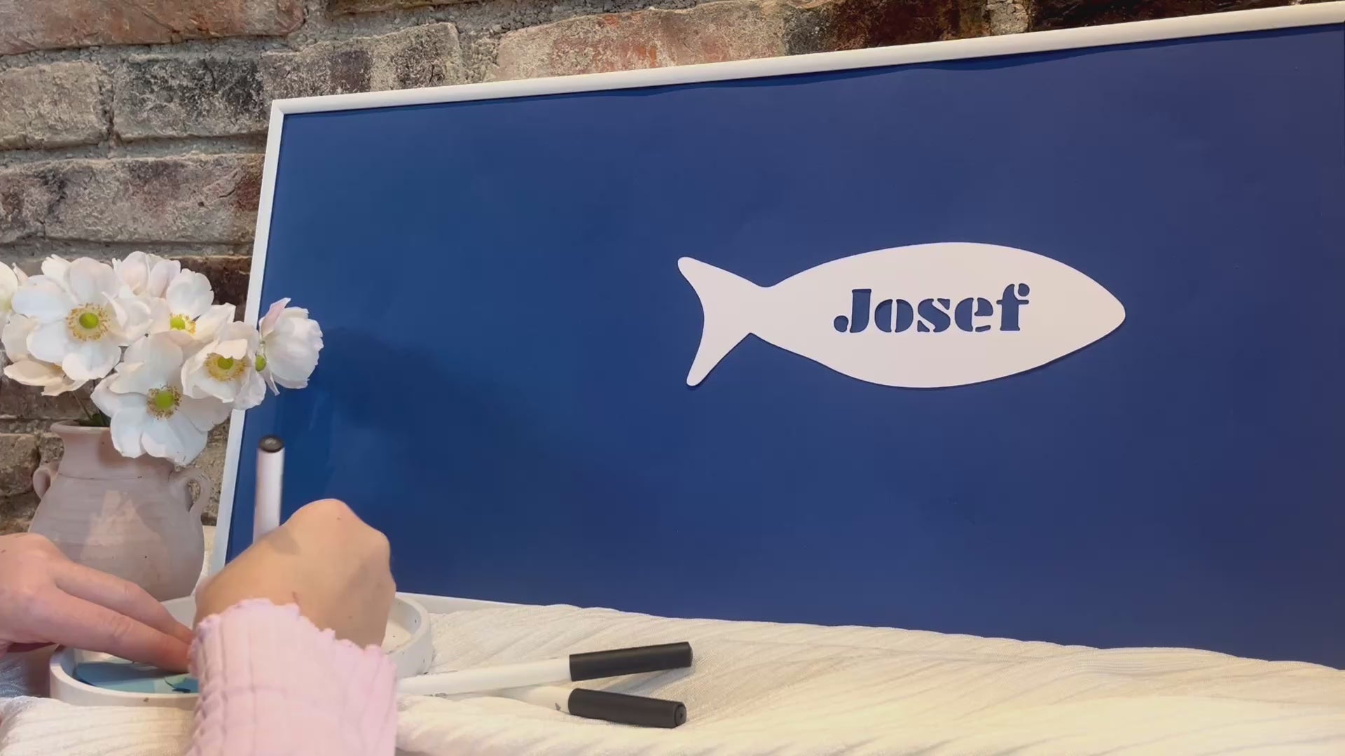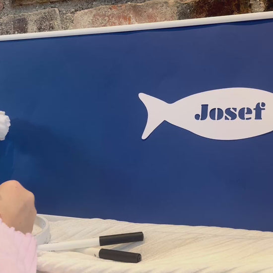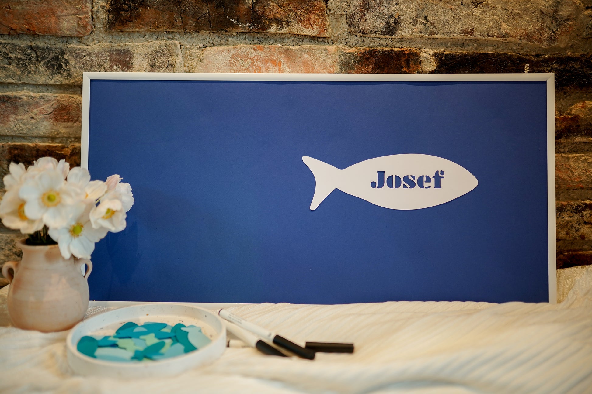 Dieses besondere Gästebild für die Taufe lädt jeden Gast ein, einen kleinen Fisch zu gestalten: Auf jeden Fisch wird der Name geschrieben und dann neben den Fisch des Täuflings geklebt. So entsteht nach und nach ein lebendiger Fischschwarm – ein Symbol dafür, dass das Kind von vielen Menschen begleitet, getragen und geliebt wird. Im Anschluss an die Taufe kann der Bilderrahmen mit dem Plexiglas geschlossen werden und fertig ist ein wunderschönes Andenken an den Tauftag, das die Nähe und Fürsorge der Familie und Freunde sichtbar macht.